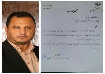 محمدعلی صحرایی به دنبال ارزیابی صورت گرفته شده توسط کارشناسان فضای سبز دفتر فنی استانداری تهران از اقدامات انجام شده در حوزه فضاهای سبز شهرداری باقرشهر در طول سال 1399 و انعکاس مطلوب این اقدامات به مدیر کل دفتر فنی توسط کارشناسان مذکور ، دبا ارسال لوح سپاس از تلاشهای محمودرضا حسن پور ؛ رئیس سازمان سیما، منظر و فضای سبز شهرداری باقرشهر تقدیر و تشکر کرد.