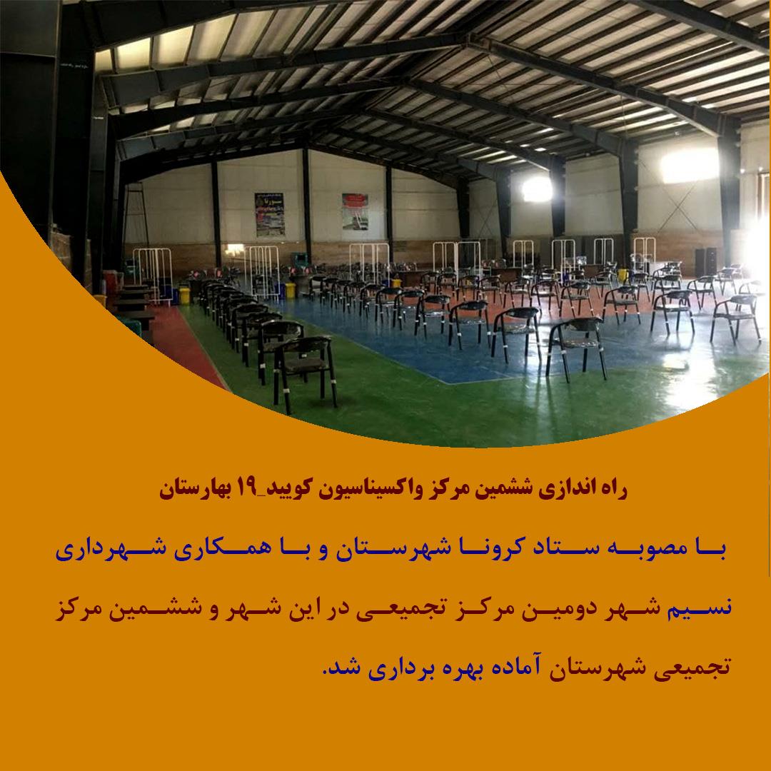 به گزارش روابط عمومی فرمانداری شهرستان بهارستان، ششمین مرکز واکسیناسیون کویید_۱۹ بهارستان پس از دستورات فرماندار بهارستان و مصوبه ستاد کرونا شهرستان و با همکاری شهرداری نسیم شهر دومین مرکز تجمیعی در این شهر و ششمین مرکز تجمیعی شهرستان آماده بهره برداری شد.
