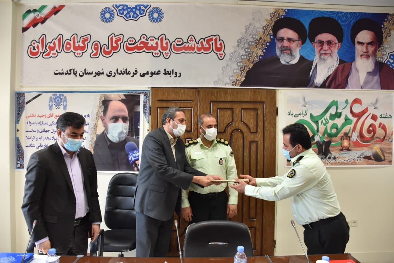 بر پایه این گزارش در پایان این جلسه جمارانی فرماندار پاکدشت با اهدای لوح سپاس از زحمات سرهنگ علی بخشی فرمانده انتظامی شهرستان و رئیس مبارزه مواد مخدر و پرسنل نیروی انتظامی بابت اقدامات موثر در راستای کشفیات و پیشگیری از عرضه مواد مخدر در سطح شهرستان تقدیر کرد.
