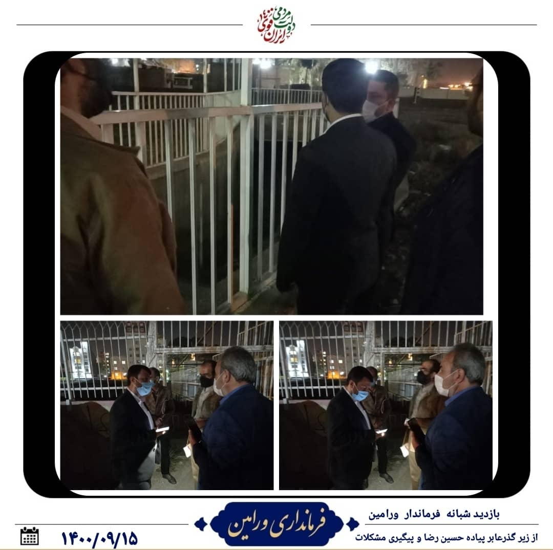 به گزارش روابط عمومی فرمانداری ورامین مجید درویشی سرپرست فرمانداری ورامین طی بازدید شبانه از زیر گذر عابر پیاده حسین رضا به پیگیری مشکلات مربوط به عبور و مرور شهروندان پرداخت .