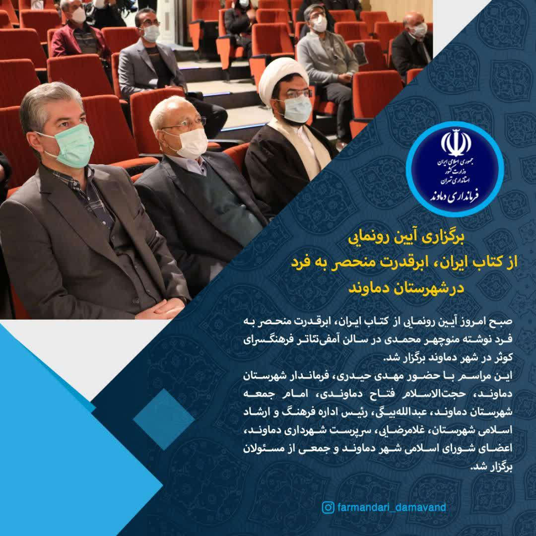 به گزارش روابط عمومی فرمانداری شهرستان دماوند، صبح امروز آیین رونمایی از کتاب ایران، ابرقدرت منحصر به فرد نوشته منوچهر محمدی در سالن آمفیتئاتر فرهنگسرای کوثر در شهر دماوند برگزار شد.