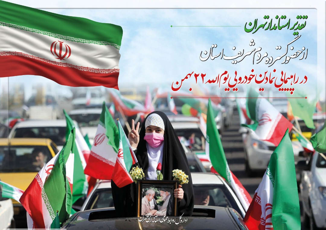 در طلیعه چهل و چهارمین بهار استقلال، آزادی و جمهوری اسلامی که گفتمان انقلاب اسلامی با گسترش محور مقاومت و مقابله با نظام استکبار و ایادی آن، فصل نوینی را در پیش روی جهانیان قرار داده، مردم شریف و همیشه در صحنه استان تهران بار دیگر دوشادوش ملت فهیم و آگاه ایران اسلامی با حضور پرشکوه خود در راهپیمایی خودرویی یوم الله 22 بهمن افتخار آفرینی کردند و عشق و ارادت خود به آرمان‌های بلند امام راحل را به نمایش گذاشتند و ثابت کردند که همچون گذشته در صحنه حاضر بوده و در حفاظت و صیانت از دستاوردها و ارزش‌ها، آرمان‌ها و اهداف والای نظام مقدس جمهوری اسلامی کوتاهی نخواهند کرد و بار دیگر، جلوه‌ای از اتحاد ناگسستنی را در مقابل چشمان جهانیان به منصه ظهور رساند.