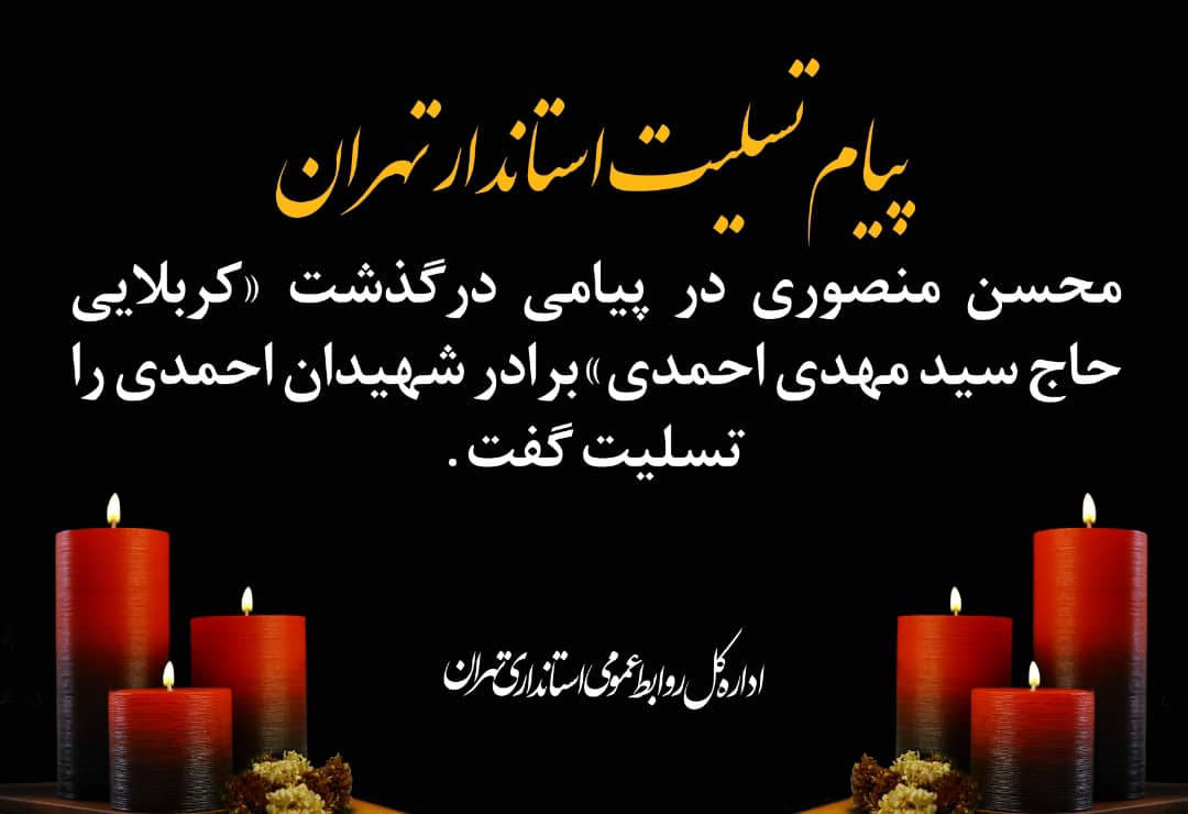 استاندار تهران در پیامی درگذشت برادر "شهیدان احمدی" را تسلیت گفت.