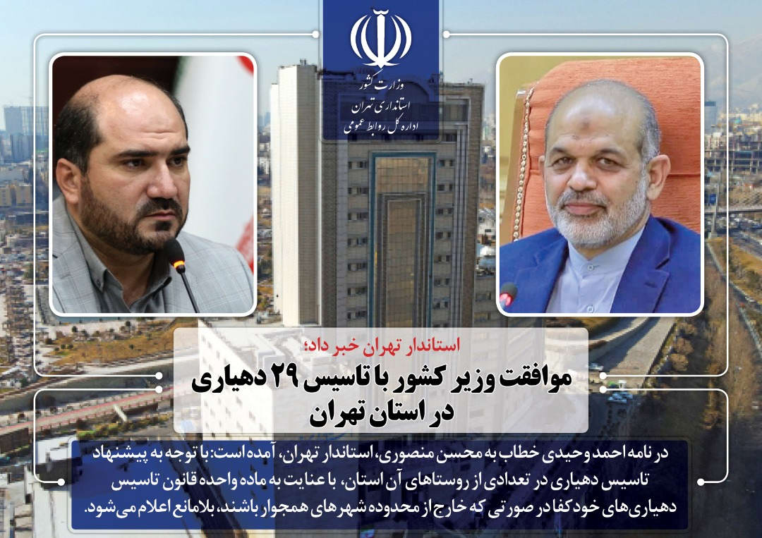 استاندار تهران از موافقت وزیر کشور با تاسیس 29 دهیاری در استان تهران و در روستاهای تابعه شهرستان‌های اسلامشهر، پاکدشت، پردیس، پیشوا، تهران، دماوند، ری، ملارد، ورامین و فیروزکوه خبر داد.