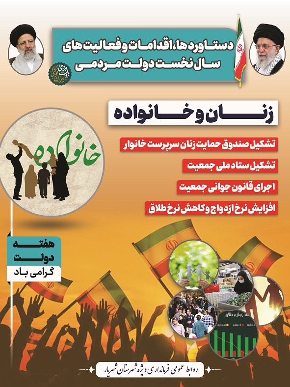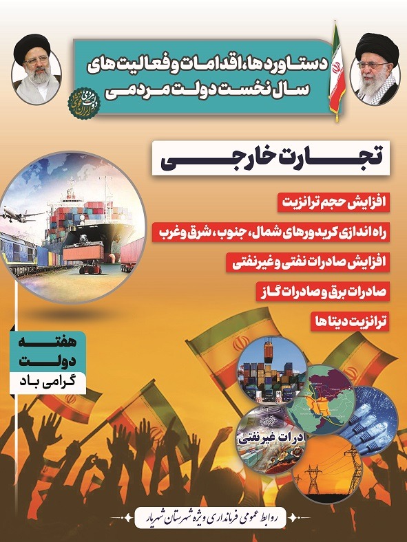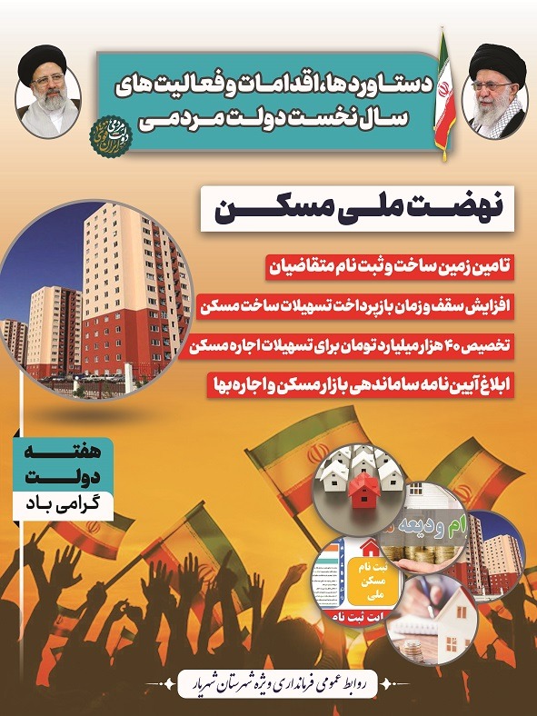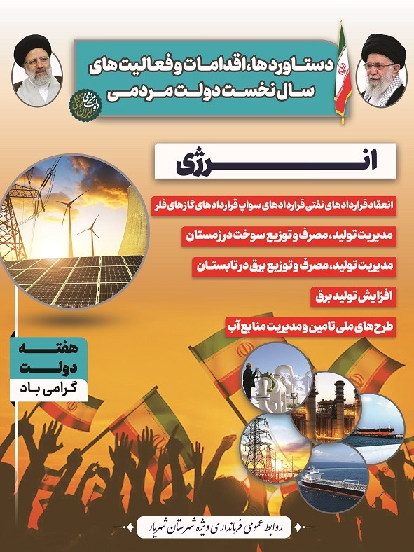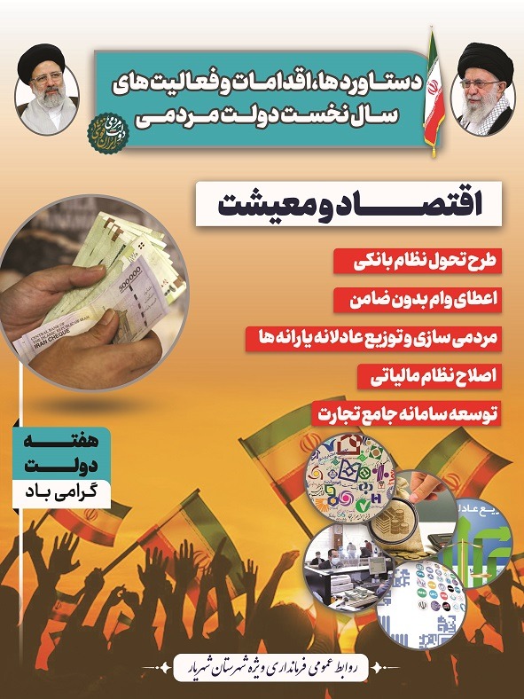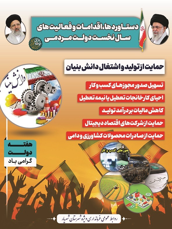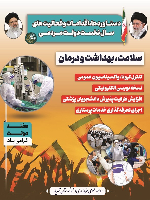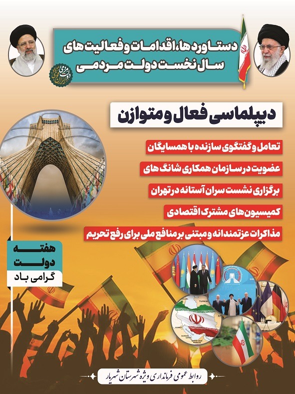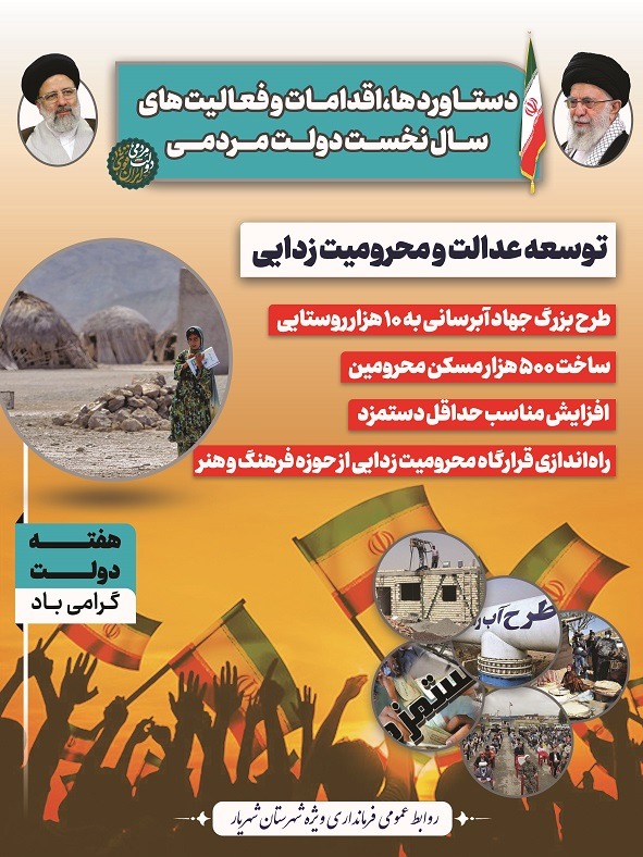 همزمان با آغاز هفته دولت، روابط عمومی فرمانداری ویژه شهرستان شهریار پوسترهای دستاوردها، اقدامات و فعالیت های دولت سیزدهم را در سال نخست طراحی و منتشر کرد