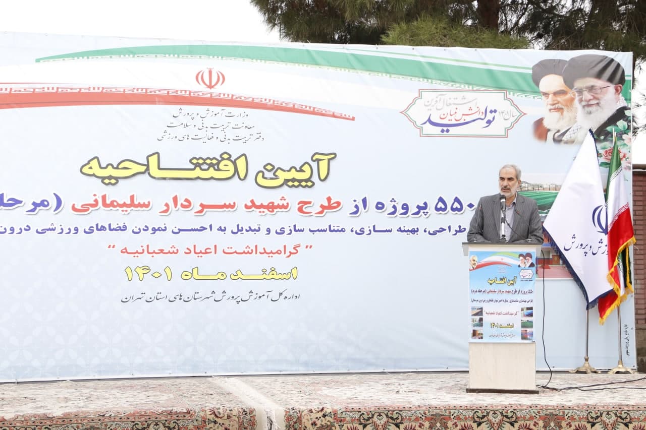 به گزارش اداره روابط عمومی فرمانداری ویژه ری، طرح شهید سلیمانی برنامه ای جامع شامل طراحی، بهینه سازی، متناسب سازی و تبدیل به احسن کردن فضاهای ورزشی درون مدرسه ای با اولویت مناطق محروم است.