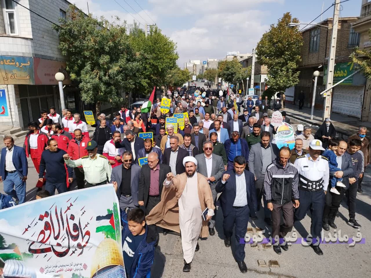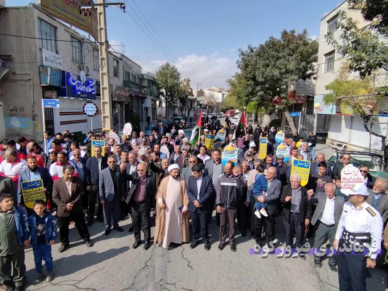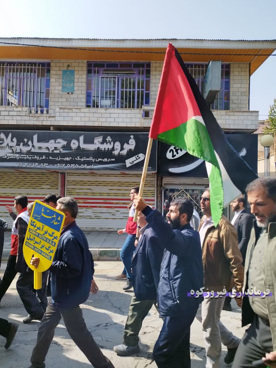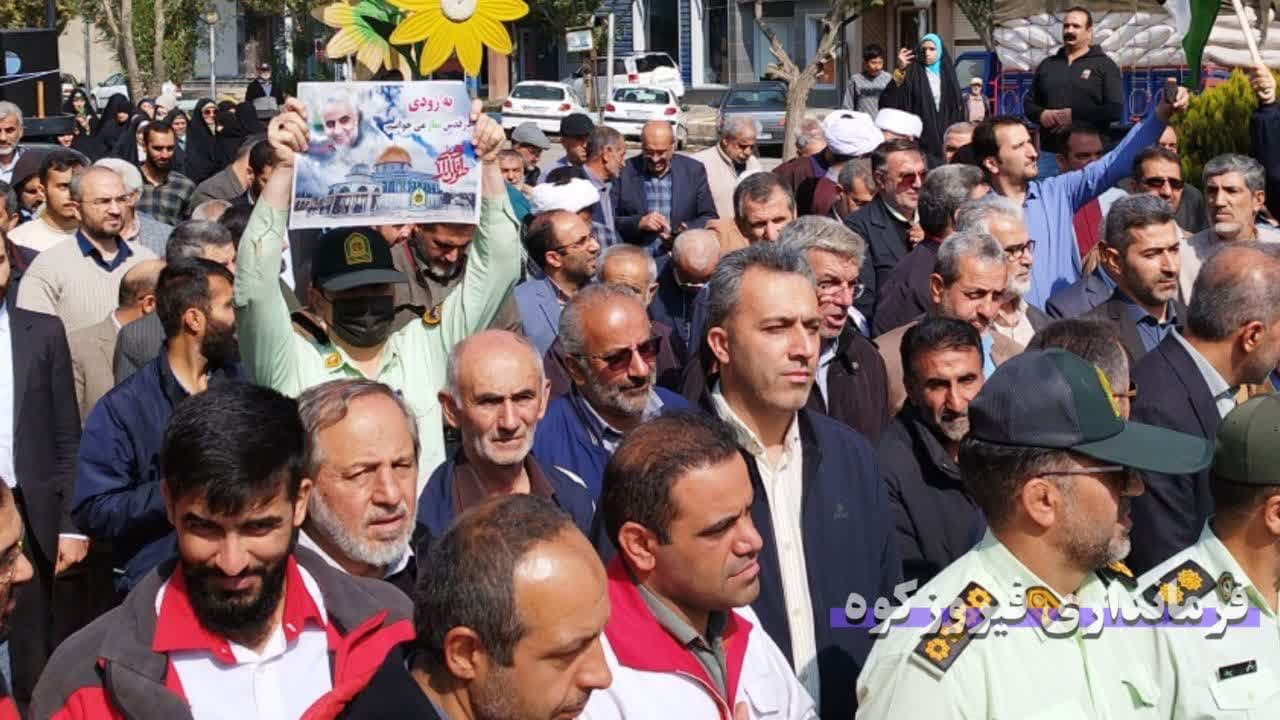 به گزارش روابط عمومی فرمانداری شهرستان فیروزکوه ، همزمان با سراسر کشور، مردم شریف و نمازگزاران گرامی جمعه و مسئولین شهرستان فیروزکوه بعد از مراسم عبادی و سیاسی نمازجمعه ، با حضور در راهپیمایی ضد صهیونیستی و برافراشتن پرچم فلسطین، ضمن محکوم کردن جنایات و حملات رژیم صهیونیستی و اعلام حمایت خود از مردم مظلوم فلسطین، شادی خود را از پیروزی نیروهای مقاومت فلسطین در عملیات موفقیت آمیز طوفان الاقصی اعلام کردند.
