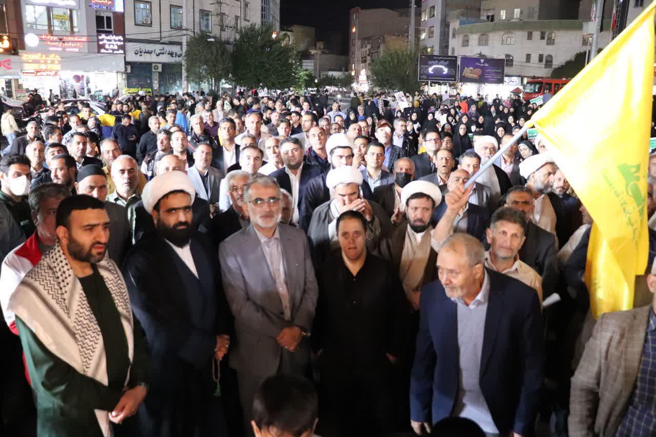 تجمع اعتراضی مردم ولایتمدار شهرستان قدس در پی حمله رژیم غاصب صهیونیستی با حضور مسئولین و شهروندان برگزار شد.