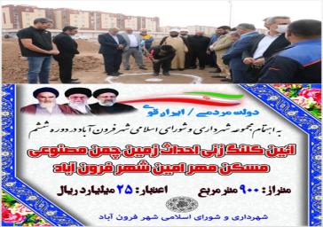 محمد عسگری فرد سرپرست شهرداری فرون آباد گفت: کلنگ احداث زمین چمن مصنوعی مسکن مهر امین به متراژ 900 مترمربع و با اعتبار 25 میلیارد ریال پیش از ظهر امروز و با حضور مسئولین شهرستان پاکدشت و شهر بر زمین زده شد و ان شاءالله و در صورت عدم مشکل طی 2 ماه آینده به بهره برداری خواهد رسید.
