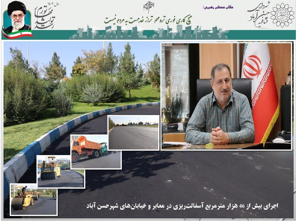 به گزارش روابط عمومی شهرداری وشورای اسلامی شهرحسن آباد: شیرزادیعقوبی شهردارحسن آباد مناسب‌سازی و عملیات روکش آسفالت مکانیزه در معابرشهر بویژه درمحور اصلی را از مهم ترین برنامه های شهرداری دانست وافزود، باتوجه به قرارگرفتن جاده ترانزیت پایتخت به شهرها واستانهای جنوبی کشوروعبورماشین آلات سنگین ازبلواراصلی این شهر وباتوجه به اینکه یکی از مطالبات شهروندان موضوع روکش آسفالت بلوارامام خمینی (ره) ومعابردیگر شهری بویژه ورودی شهرحسن آباداز مسیرآزادراه خلیج فارس بوده است ،شهرداری براساس اولویت بندی ، وبراساس مصوبه شورای محترم وانجام مراحل قانونی وتائین پیمانکار،پروژه آسفالت معابررا آغاز وتاکنون 46هزارمترمربع از معابرشهرازجمله بلوارامام خمینی (ره) درمحله کنارگرد، ورودی شهرحسن آباداز مسیرآزادراه خلیج فارس ،میدان قائم،خیابان بسیج ،خیابان شهدای هویزه،انتهای خیابان مصلی وتعدادی از معابرفرعی شهر با اعتباری بالغ بر110 میلیاردریال به انجام رسید.