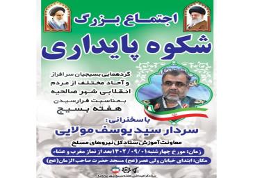 یکی از همین برنامه ها برگزاری اجتماع بزرگ شکوه پایداری باهدف گردهمایی بسیجیان سرافراز و مردم انقلابی دیار اخلاق و فضیلت در محل مسجد جامع حضرت صاحب الزمان(عج) است که با حضور و سخنرانی سردار سید یوسف مولایی معاون آموزش ستاد کل نیروهای مسلح همراه خواهد بود .