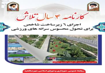 به گزارش روابط عمومی شهرداری صالحیه، شهرداری صالحیه در چهارسال اخیر به توسعه زیرساخت های ورزشی مبادرت ویژه ای کرده و افزایش چشمگیر این سرانه در مقایسه با حوزه های دیگر اجتناب ناپذیر است اما نکته انکارناپذیر همه این فعالیت ها، اوج گرفتن زیرساخت های ورزشی در در دوره ششم شورای اسلامی است.