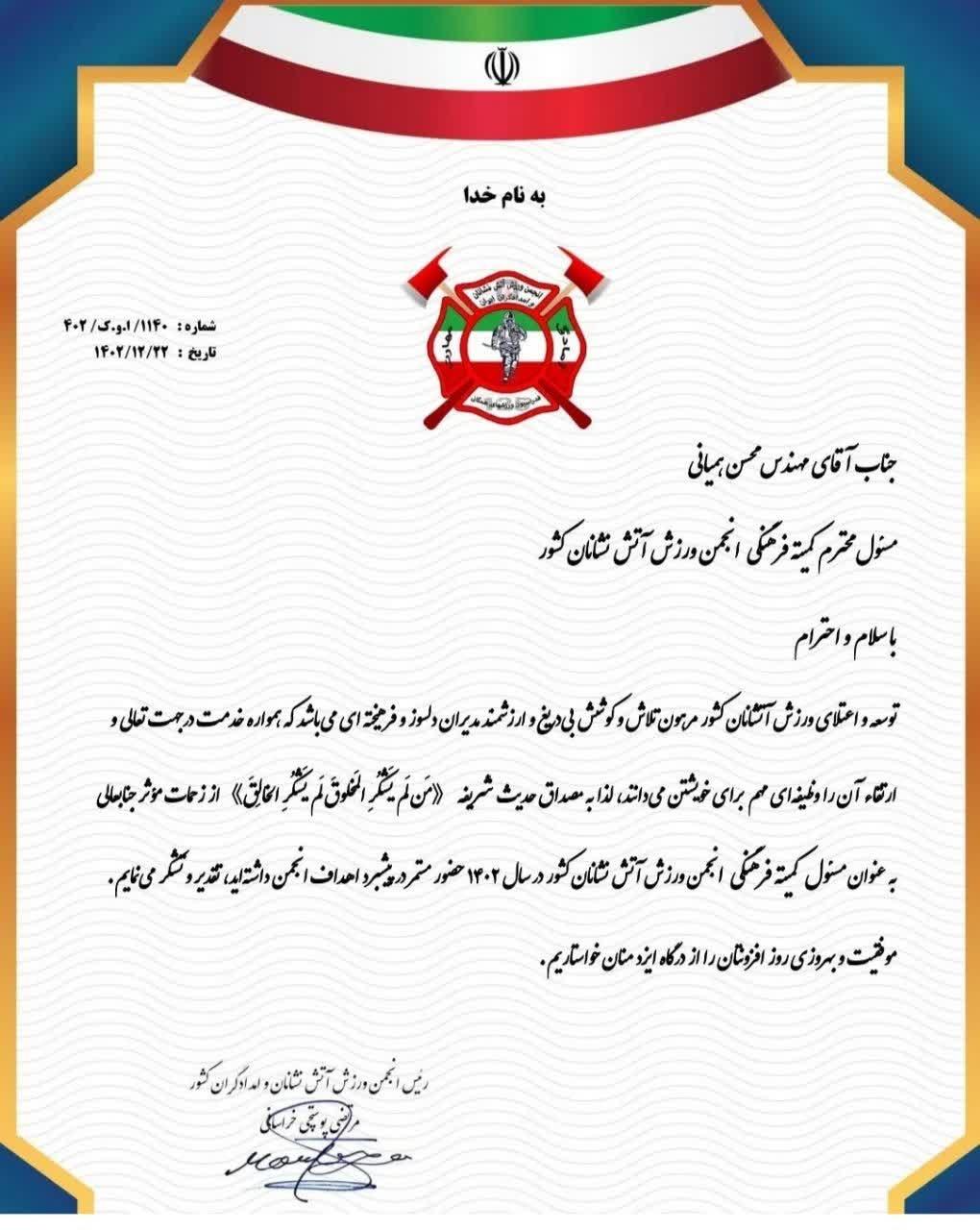 رئیس انجمن ورزش آتشنشانان و امدادگران کشور با اهدای لوح از زحمات و تلاشهای رئیس سازمان آتشنشانی و خدمات ایمنی شهرداری قدس در کمیته فرهنگی این انجمن تقدیر کرد.