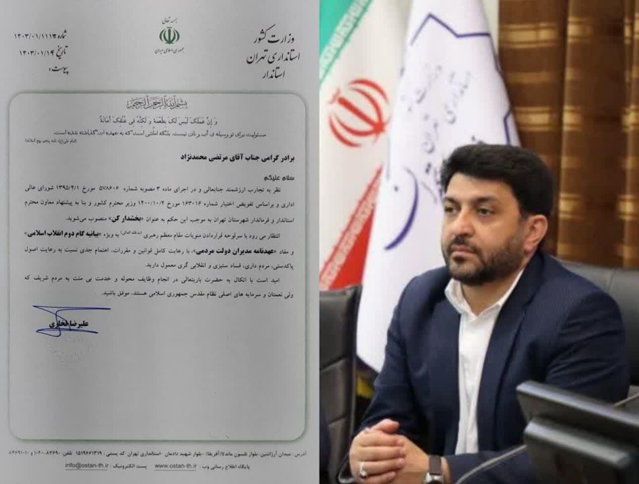 در بخشی از حکم صادره از سوی استاندار تهران آمده است: انتظار می رود با سرلوحه قرار دادن منویات مقام معظم رهبری مدظله العالی، به ویژه «بیانیه گام دوم انقلاب اسلامی» و مفاد «عهدنامه مدیران دولت مردمی» با رعایت کامل قوانین و مقررات، اهتمام جدی نسبت به رعایت اصول پاکدستی، مردم داری، فساد ستیزی و انقلابی گری معمول دارید.