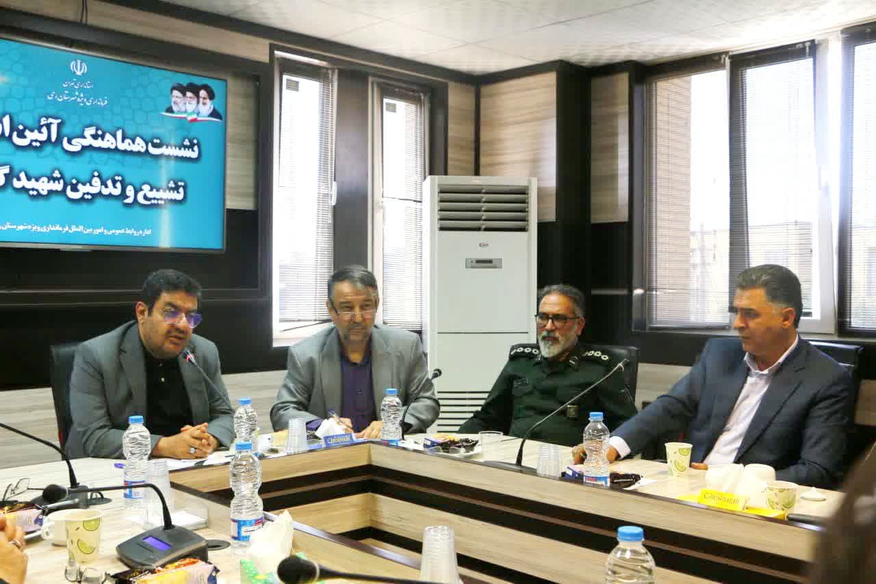 در این نشست که باحضور شیخ محمدی سرپرست معاونت سیاسی، امنیتی و اجتماعی فرمانداری، نصرالله رئیس بنیاد شهید و امور ایثارگران، کلهر شهردار کهریزک، همتی شهردار باقرشهر، پایخوان جانشین ناحیه مقاومت حضرت روح الله «ره» و مسئولین شرکت نفت برگزار شد، آخرین هماهنگی های لازم جهت برگزاری هرچه باشکوه تر مراسم استقبال و تشییع پیکر پاک شهید و مراسم تدفین در محل شهرک انرژی ری انجام شد.