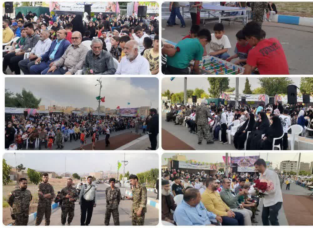 اجرای گروه سرود، مسابقات، هنرهای ورزشی رزمی، عروسک گردانی، پذیرایی توسط موکب ها و توزیع کیک ۱۸‌متری بین شهروندان از جمله برنامه‌های این مراسم بود.