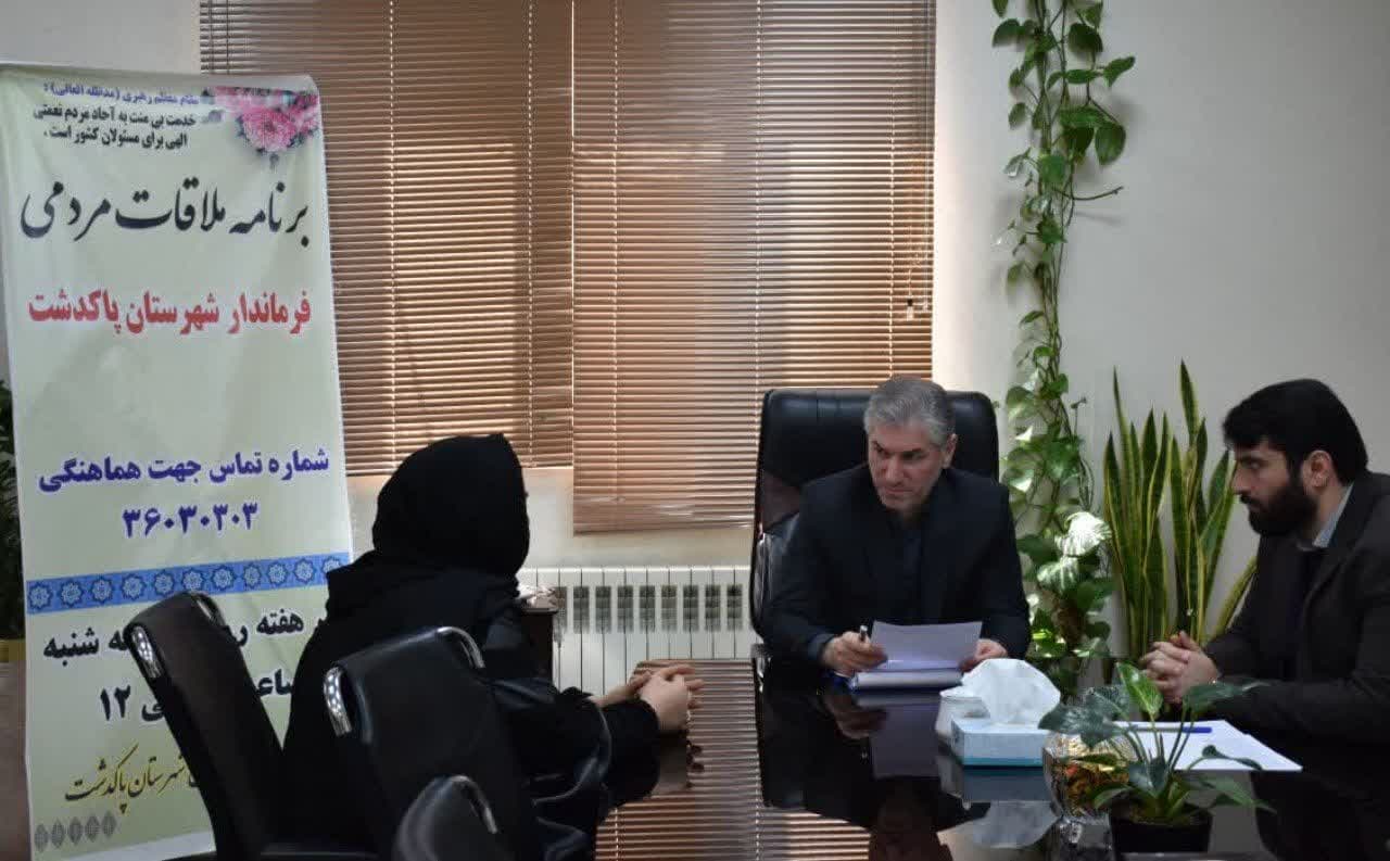 برنامه ملاقات مردمی سرپرست فرمانداری پاکدشت به منظور پاسخگویی به مراجعین در محل فرمانداری برگزار شد.