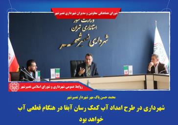 شهرداری در مواقع قطعی آب در طرح امداد آب و نذر آب به کمک آبفا می آید و برای مردم آبرسانی خواهد کرد.